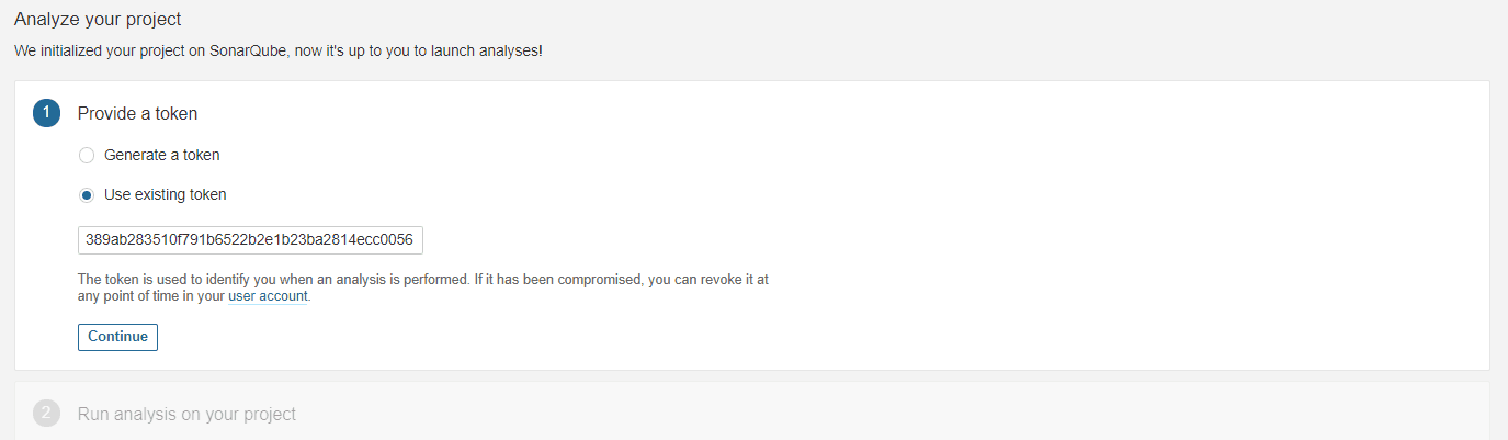 回到 SonarQube 首頁點擊 Add Project 選擇 Manually,接著輸入 Project key 及 Display name 後點擊 Set Up,在 Provide a token 的地方選擇 Use existing token 並貼上我們剛剛產生的 token 後按 Continue,完成這個步驟後就先將畫面停留在這邊,可以開新分頁完成 Jenkins 整合的部分