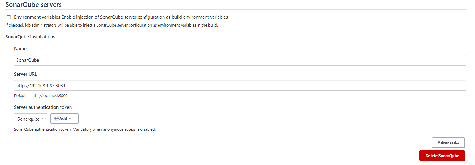 在 Jenkins 頁面點擊 Manage Jenkins -> Configure System -> SonarQube servers,這邊輸入 SonarQube Server Name 及 URL 並選擇連接 token 後按 Save 保存設定